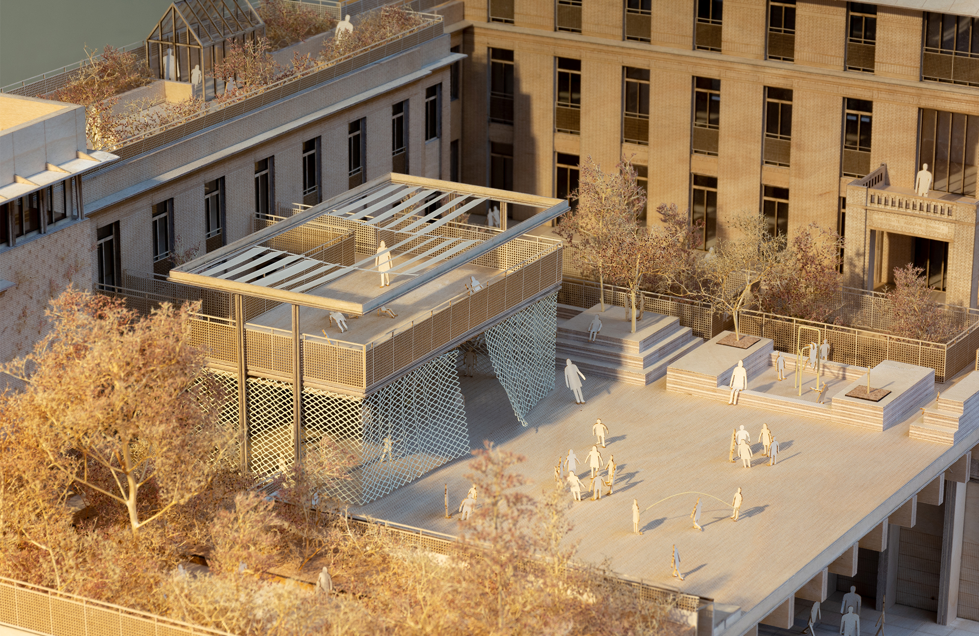 Sur l’empreinte de l'unique bâtiment démoli, un jardin suspendu se déploie : lieu d’observation et d’expérimentation destiné aux enfants de l’école comme aux riverains et associations, il constitue un outil pédagogique majeur et illustre le lien que nous pensons fondamental entre humain, nature, culture.